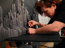 ![]() "Lithos Magnes"Multi media 150x200x20cm LITHOS λίθος het oude Grieks voor steen. Magnes voor magneet. In dit werk bouwde ik een stad met in het midden 'hangend' een lithos die ik bedekte met bladgoud en een magneetje. Aan de achterzijde van dit werk 'hangt' het tegenpolige magneetje met een muziekdoosje. Het getekende meisje (the-self) zweeft hierdoor tussen de muziek (achterkant) en de gouden steen/aarde (voorkant). Ze word bespeeld (de rode draden). de stipjes op de gebouwen zijn gezet met een marker. | ![]() |